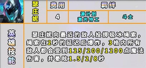 2:技能描述为,猪妹向最近的敌人投掷极冰绳索,绳索在两秒的延迟之后就会爆炸,三格内所有的敌人都会受到125,200,1200点的魔法伤害,并且眩晕1.5,2,8秒;