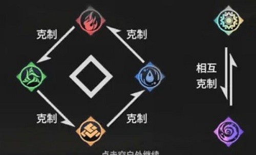 1:游戏中的克制关系是火克制风,风克制土,土克制水,水克制火,光暗两个互相克制;